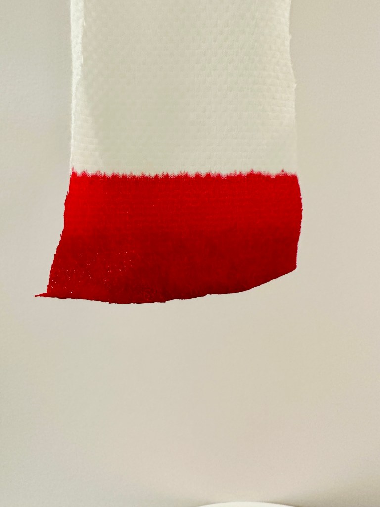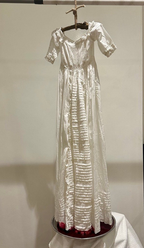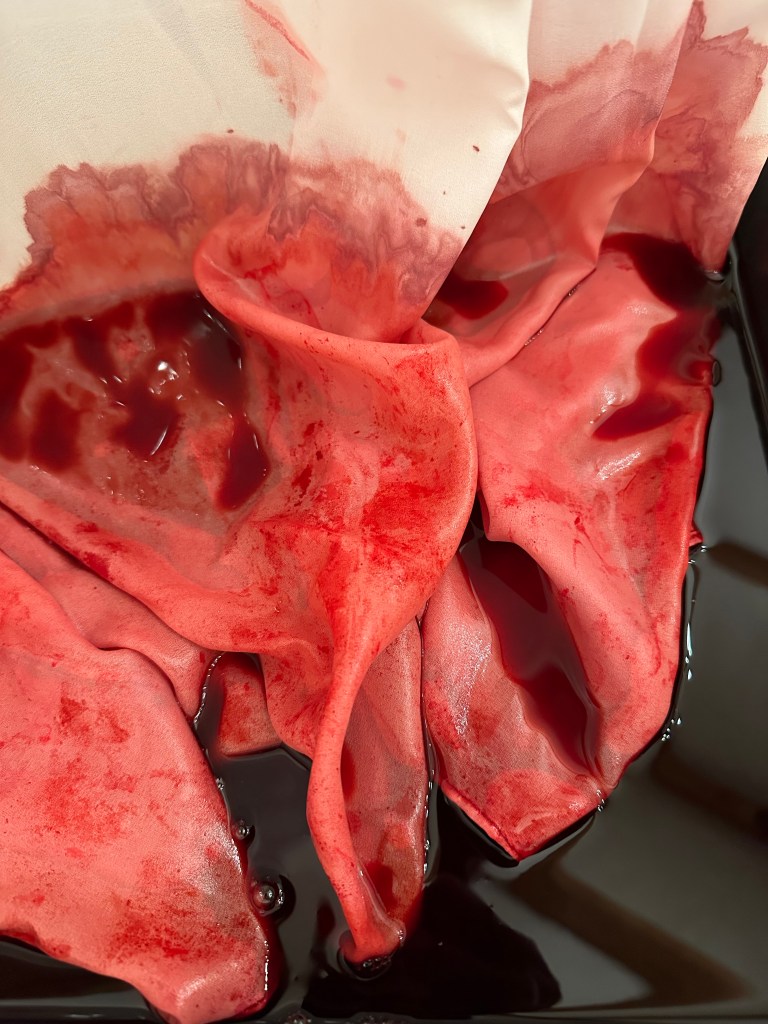 I decided to cut off the end of the nylon veil as it was soaked in dye but it had not absorbed the colour in the way I had hope. I was struck how the cut off piece of fabric looked in the bucket and it made me think of the Abortion Pastels by Paula Rego. Although we cannot see inside the buckets that are in the Triptych, we are in no doubt what the bucket will hold. I find these images of Rego’s extraordinarily powerful. The women are clearly young and Rego portrays their vulnerability but also she show them in their magnificence, bravery and pain. Rego produced this series to show the reality of many women in Portugal when abortion was illegal but for me it also shows how these women are left alone to deal with the consequences of sex. Once the pleasure has been had, they deal with the pain. The discarded fabric looked brutal and I saw a connection between the purity that is expected in the wearer of these ceremonial dresses and the young women who found themselves pregnant in a country where, at the time, they did not have the right to choose abortion. Although I had not originally intended this and had only cut off the end of the veil for convenience, once severed from the dress, the dress remained white, homoginised, bleached of colour, difference, individuality. But the discarded piece of dyed veil looked almost fleshy, like it had been cut from a body and was glistening with blood. I felt there was a powerful contrast to the to the dry, white, starched dress and the wet, bloody, pooled veil in the bucket.