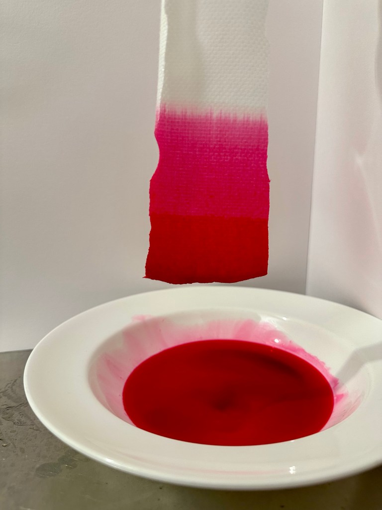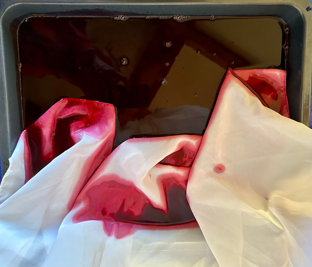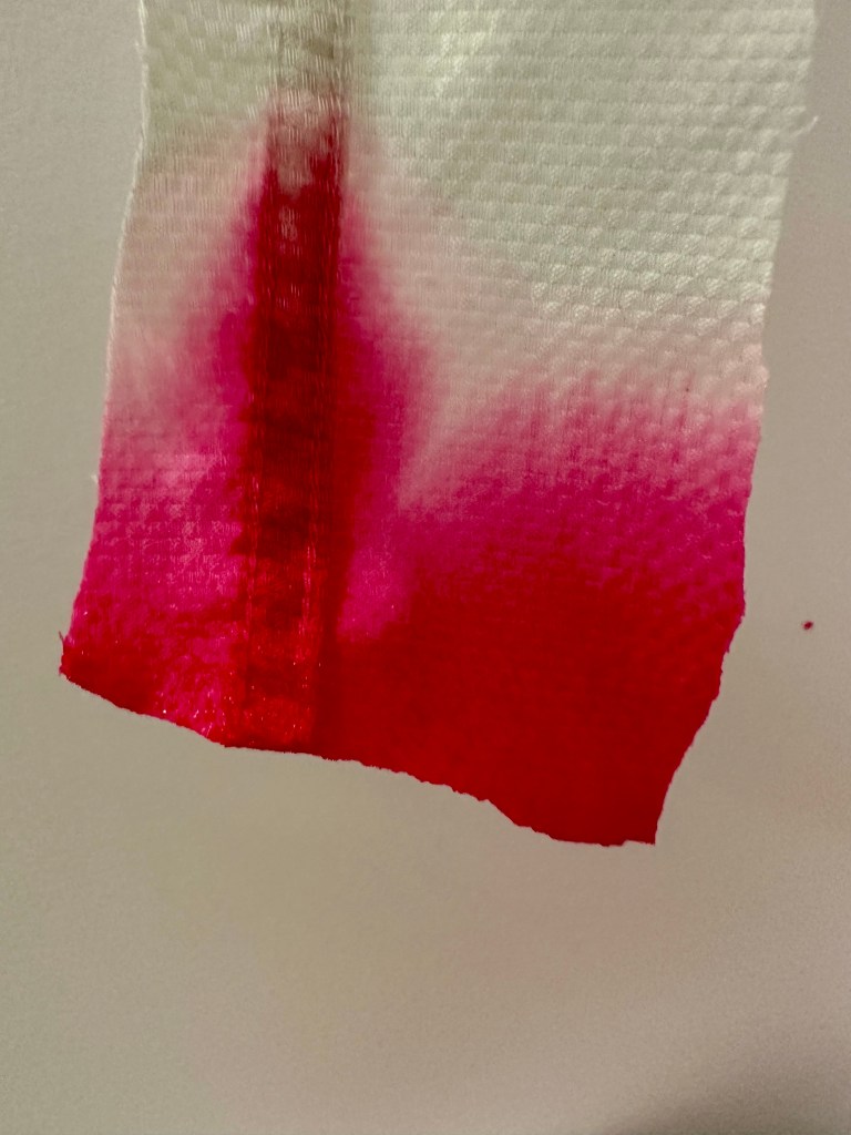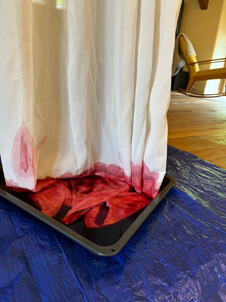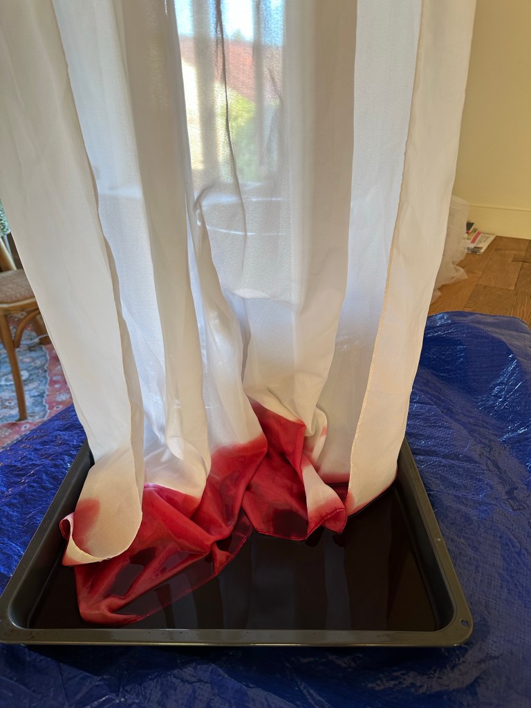 I tried working with dye and fabric and how it might look if I let the colour be sucked up by the white fabric. It worked well with cotton but the veil of the dress is nylon and it doesn’t appear to absorb so well.