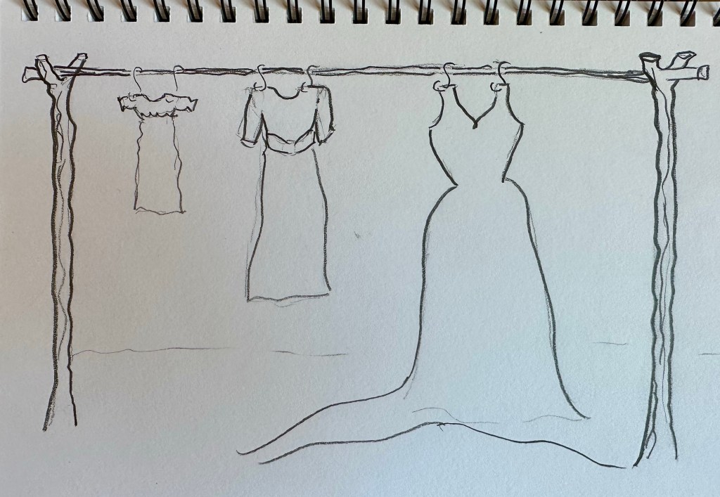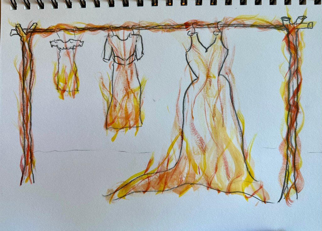 This has helped me work out exactly how I want the final piece to look. It’s also helped me think about the logistics of how tall the frame should be? how will I attach the dresses? How can I get everything to burn evenly at the same time? How will I film it and actually do the burning at the same time? It’s also helped me refine my ideas and be realistic in what I can achieve for the final result.