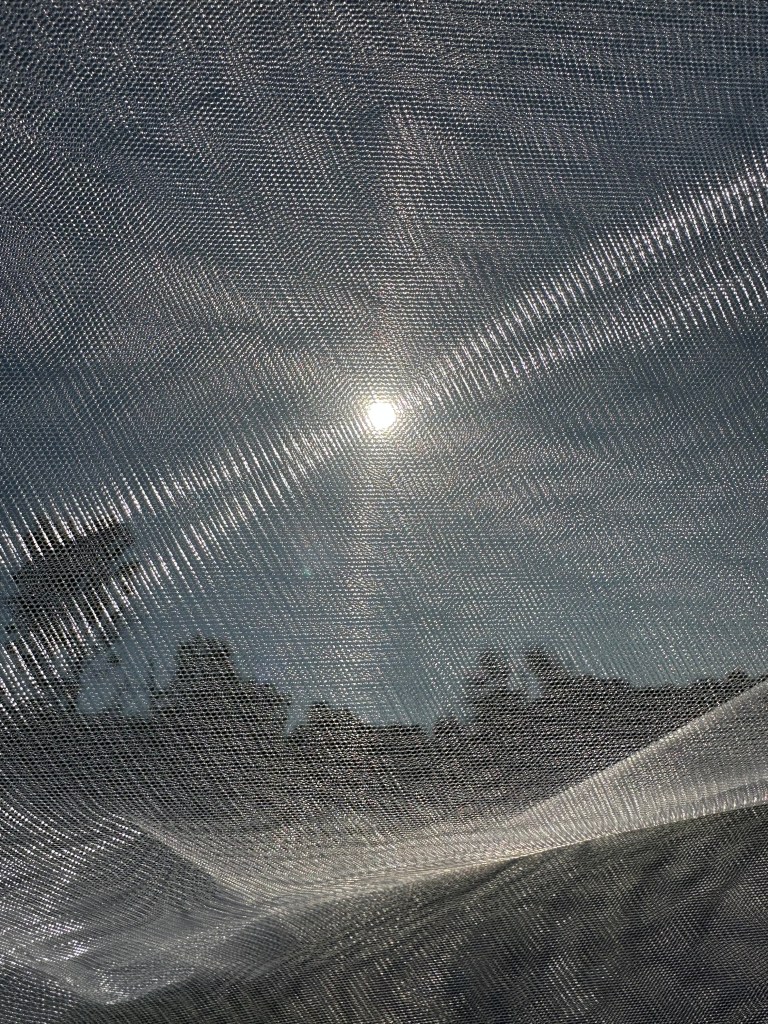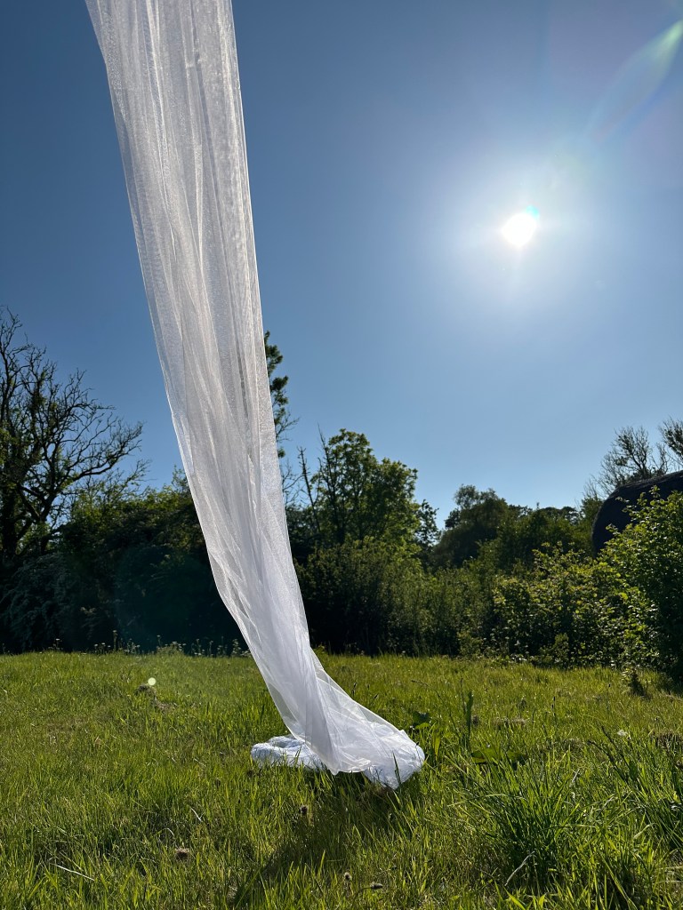 I took the veils and dresses outside and photographed them and I noticed how the veil obscured the beautiful day just as it would obscure the beautiful bride. Looking at the images, especially the first once, the veil looks almost surreal as it fluttered in the afternoon breeze. I was using only the bright early afternoon sunshine but the fabric of the veil looked as if it was lit by ringflash, giving the bizarre quality to the image.