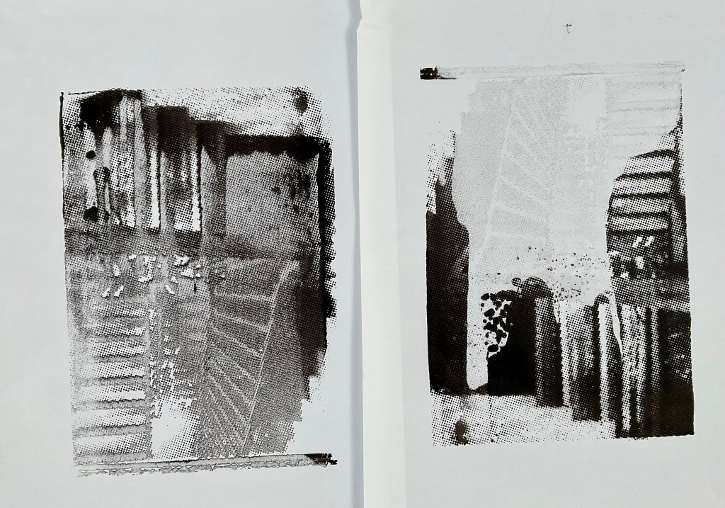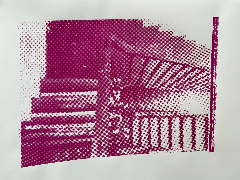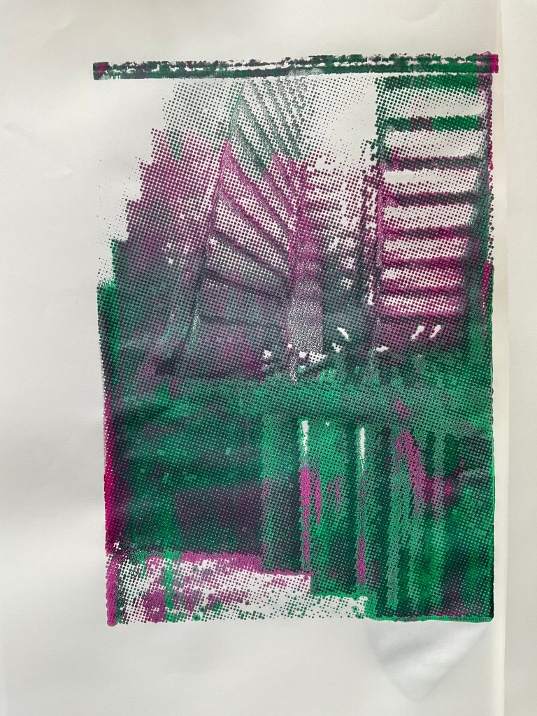 My classmate and I teamed up in our initial lesson. I found it hard to remember all the processes on my own so it was great to work with Lawrence. We experimented with differnt colours of ink on the same ‘pull through’ and we also printed on to a plain pull through background which was really successful I believe.