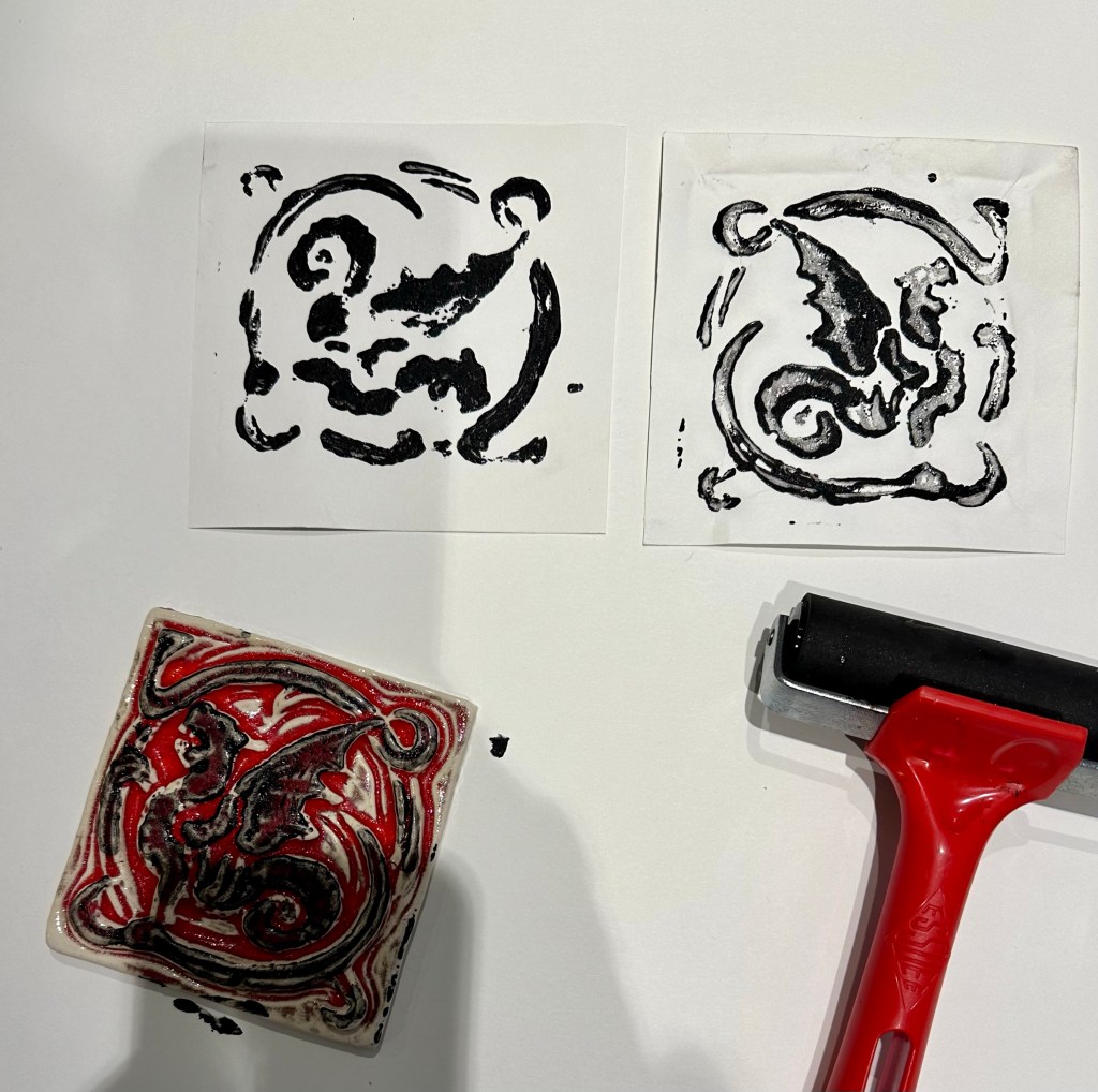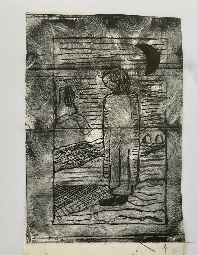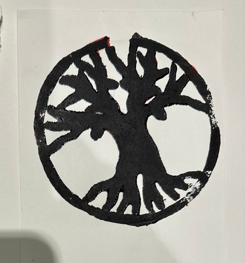 First I drew what I intended to cut into the Tetrapak. I chose a simple image from a Tarot card. I then tried printing leaving some intentional swirls of ink on plate. It didn’t look as good as I hoped. I continued to experiment with wiping away ink in different areas. I can see how there are so many possibilities of entirely different outcomes just but adjusting the inking process.