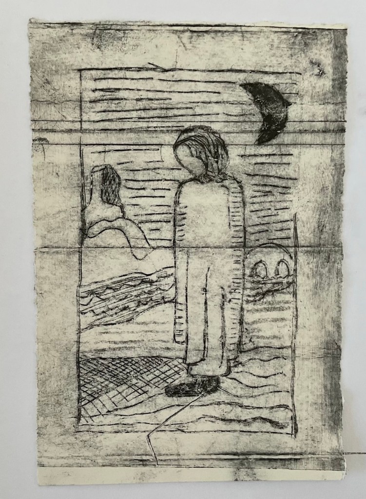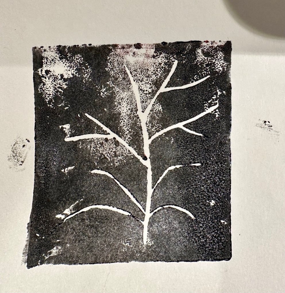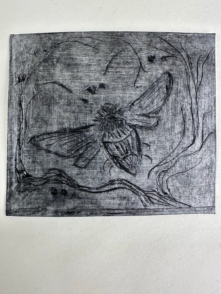 I tried a second collograph and could see that already I found the etching process easier than my first attempt as I was a little more familiar with the process. I sketched/etched a bee and used the dentist tool to do this. I was pleased with the result and I tried a couple of different ways to apply the ink. I also experimented with different ‘dampnesses’ of paper. I would like to make time to experiment more with Intaglio printing using different surfaces like copper zinc etc to etch a design.