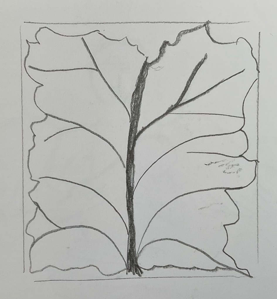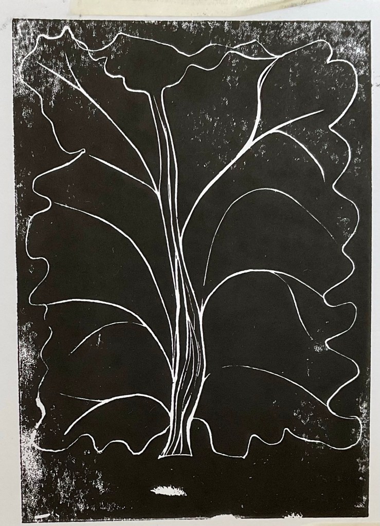 Woodblock, cabbage and Linocut. I tried to print an image using half a white cabbage but it didn’t work. I used acrylic paint and I could not get an definition or detail. I used a wood carving of a tree to create repeat images. I experimented with rolling the print ink directly on to the wood itself and applying different pressured when i pushed it in to the paper. This achieved a variety of different results. I learnt that using printing ink for block printing gives far superior results.