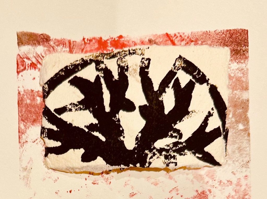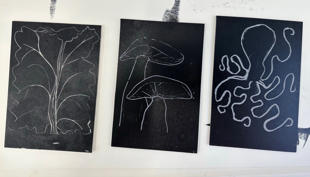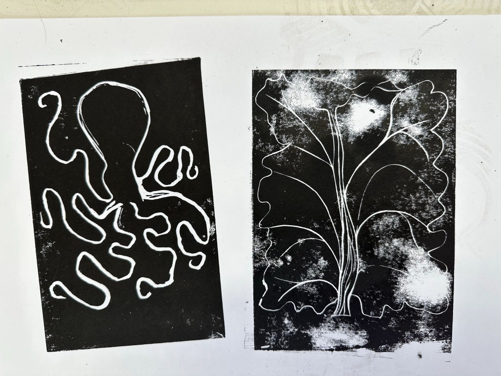 I tried a variety of tools to create linocuts and the collograph. I found it harder than I expected to control the tools and to scratch out fine details.