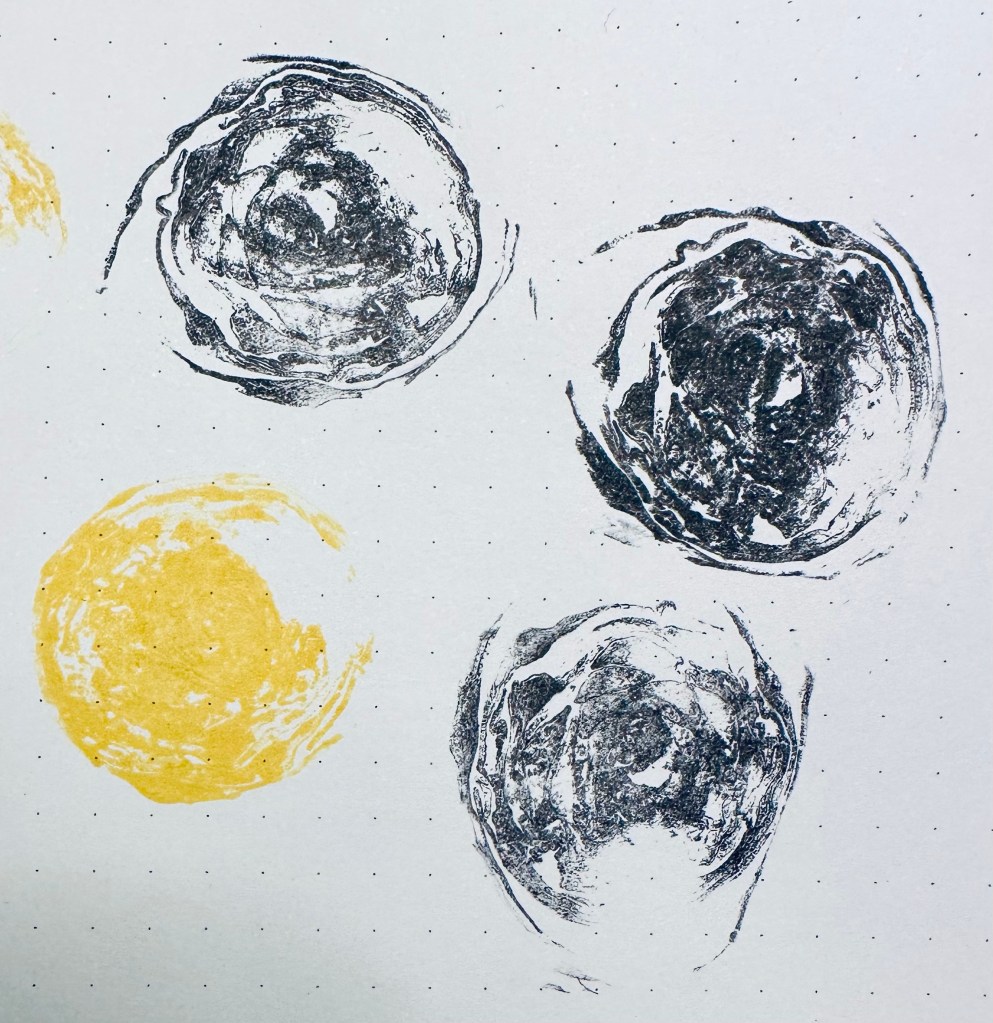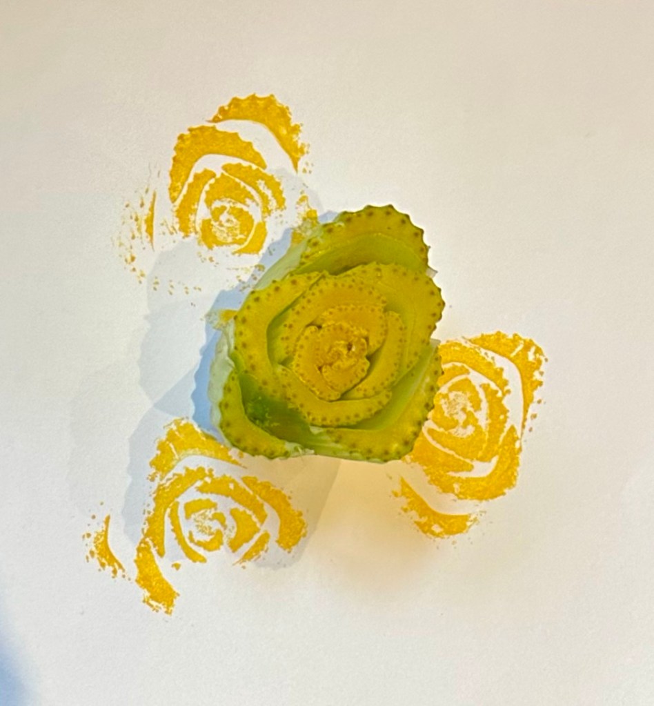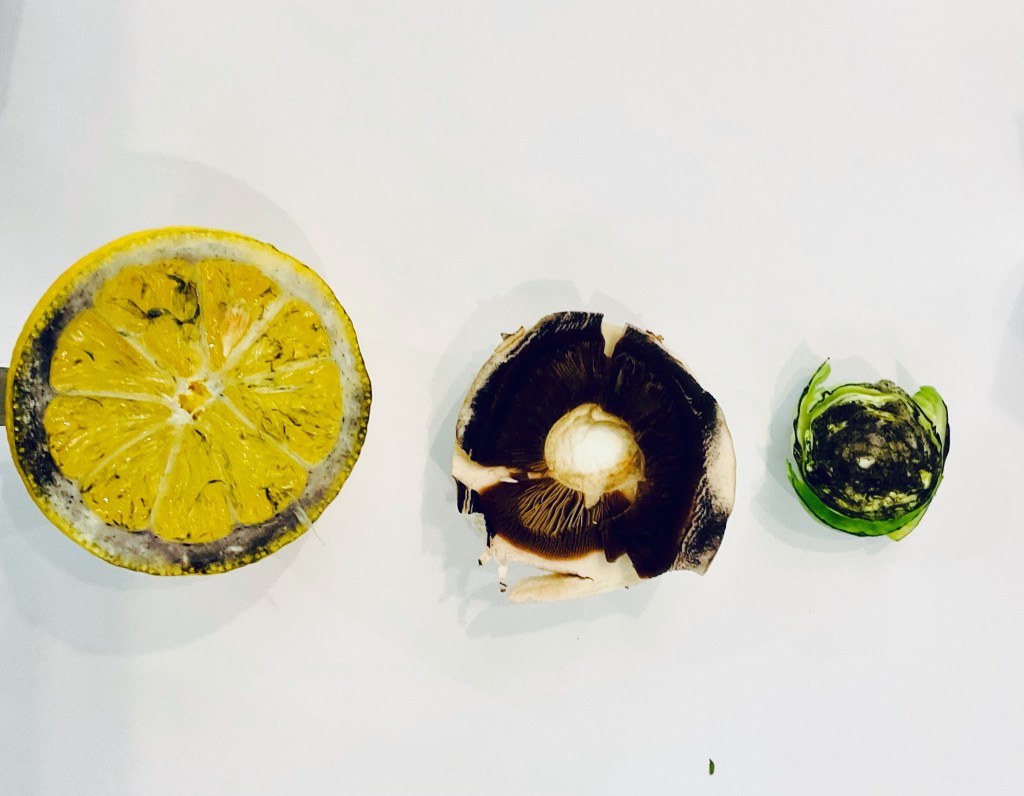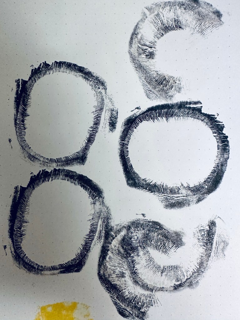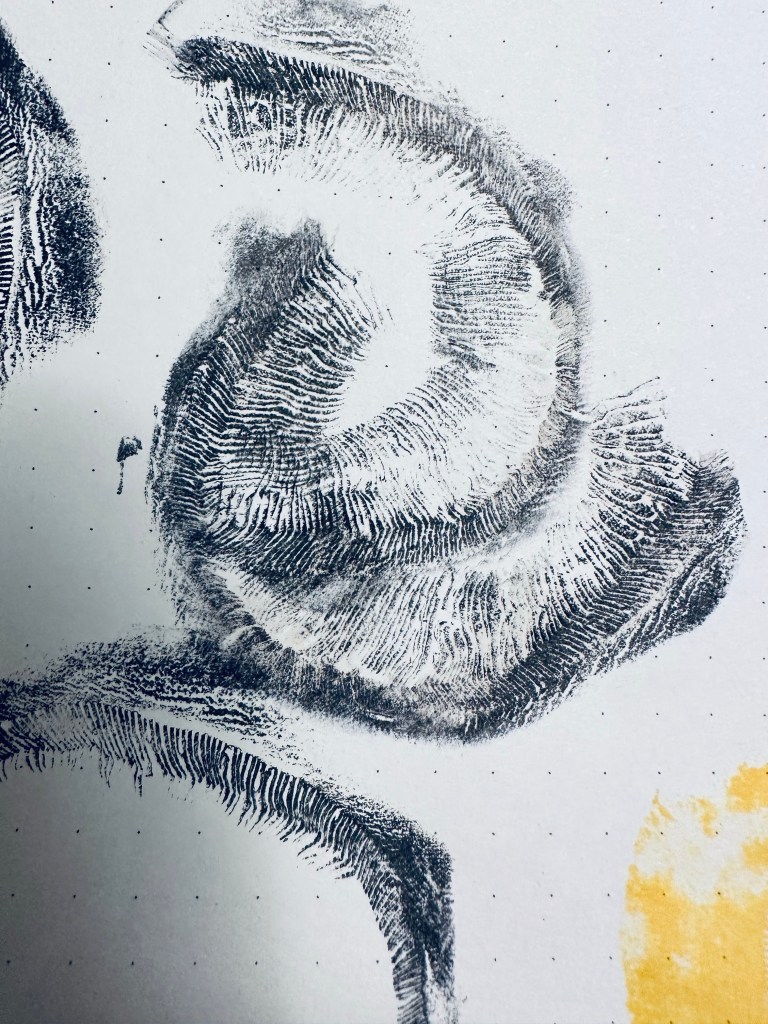 MUSHROOMS I was unsure if using a mushroom would work but although I couldn’t capture the whole mushroom shape as it was too soft, I was pleased with the detail in the prints of the delicate underside of the ‘cap’ which looks almost like eyelashes.