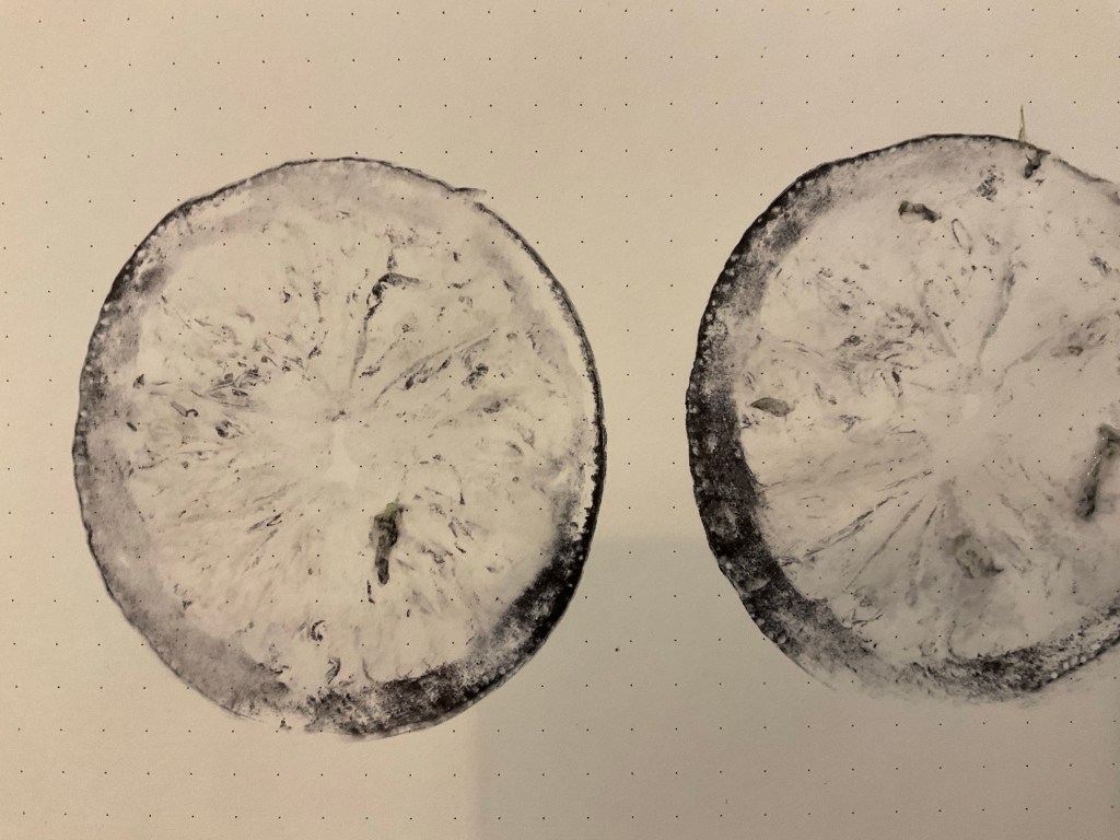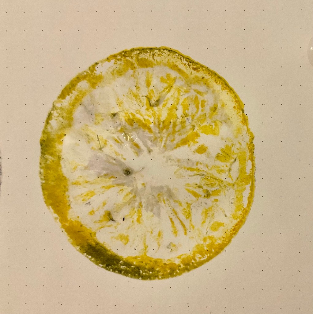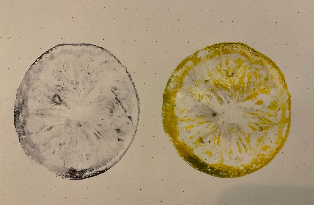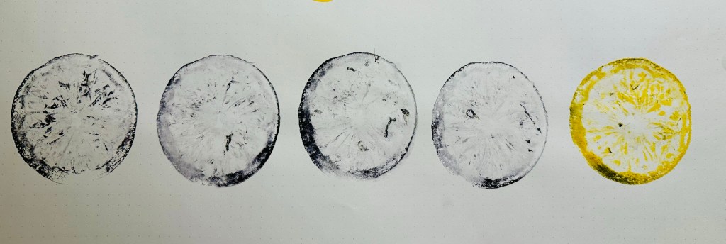 LEMONS. I cut a lemon in half and dabbed the juiciness away so it was just damp. I then ground it into a ink pad and the pushed it on to paper, leaving it for 15 seconds so it would sink into the paper. I was very pleased with my lemon print using yellow ink. I like how although it is obviously a lemon, it has a strange almost 3d quality to it around the rind bit. I also used a black ink pad as well to make repeat designs.