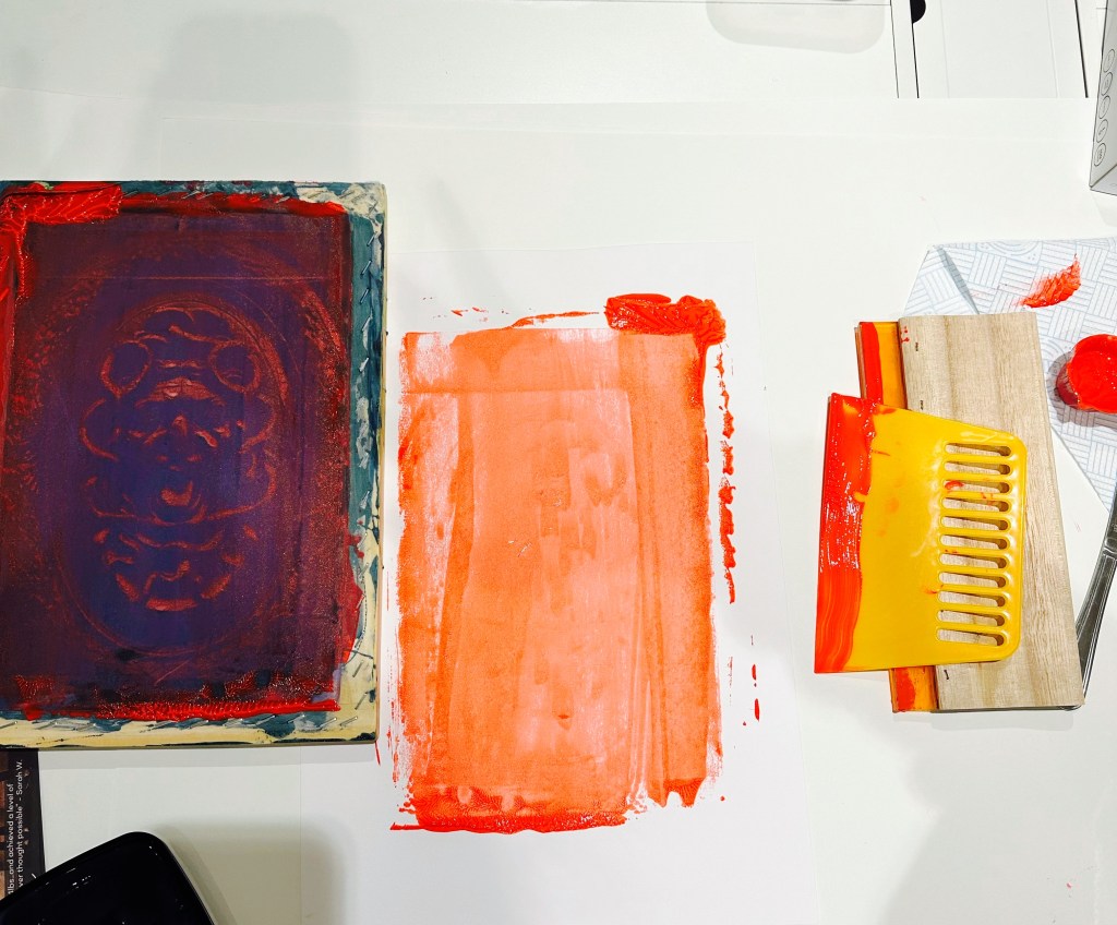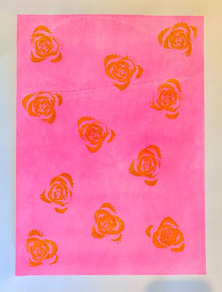 This was a successful outcome combining two different types of printing: drawing a plain screen of colour using the screen printing method and then printing on top of that using the celery saturated with ink from and ink pad.