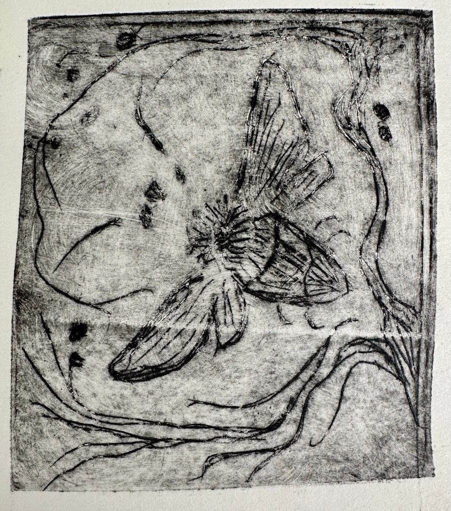 After initially finding it hard to make delicate cuts in the tetrapak, I kept practising and I was happy with the outcome of the bee. I experimented with differnt darknesses of ink and wiping areas away and I feel my final print has depth and an illustrative quality.