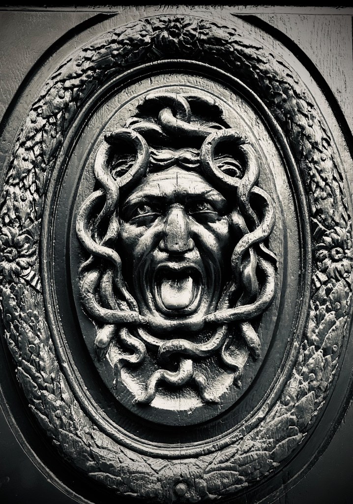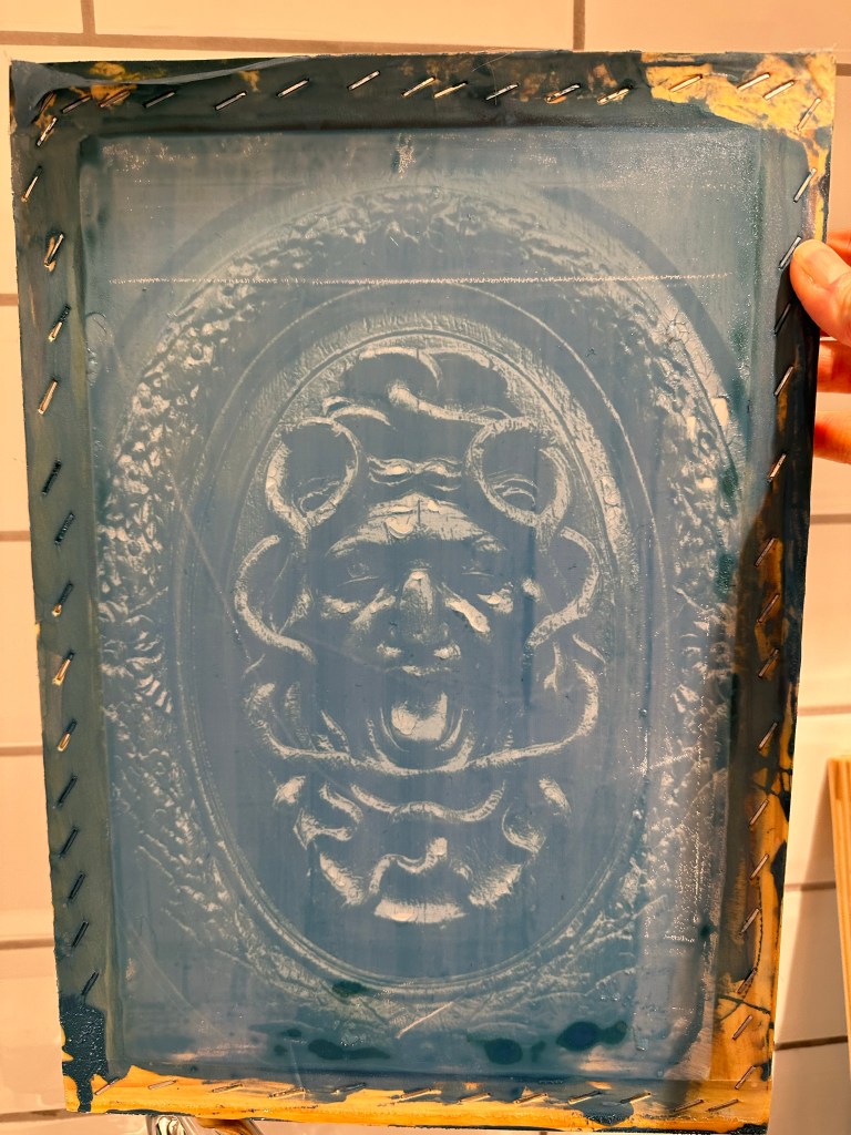 I attempted to use the celery rose print on the silkscreen as a background to photograph Barbie. I also made a halftone acetate print of a Medusa head that I photographed on a door. My intention was to create an inverted halftone image to expose on a photo emulsioned silkscreen and then my final piece would be a series of silk screen of that image. I bought a home silkscreen kit which was basic but appeared to have everything I need. Although it was time consuming, I managed to create the halftone image, print is onto acetate, mix the photo emulsion, coat the screen, dry it and then expose my image on to the screen.