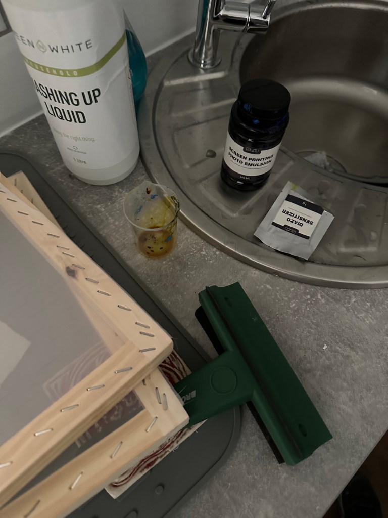 In the washing process I noticed a little bit of the emulsion coming off but it was nothing that spoiled the image. I then mixed my acrylic paint with the medium and then prepped the screen and attempted to pull the squeegee down over the silk to screen print my image. Unfortunately it did not work as I realised only after many attempts that the density of the mesh was far too fine – made for delicate fabric printing and therefore my image would not imprint on the paper. I show below the best that I achieved which was not great but I certainly learned about the importance of mesh density!