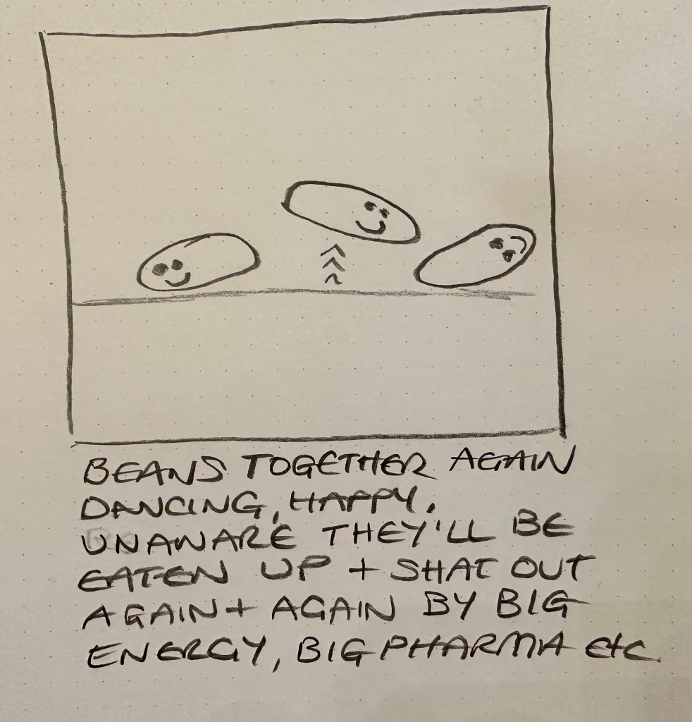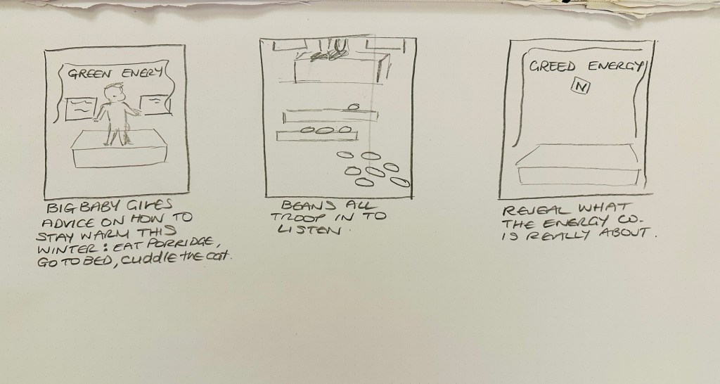 Taking this contemporary situation as my inspiration I decided to make the the genre of my animation a darkly comic satire highlighting both the preposterous messaging the customers of the energy industry is asked to swallow but also how chilling and heartless the underlying intent is. We open the film with a Big Baby speaking on a platform. Why a Big Baby? This is an archetypical image of the propagandist with which we have been familiar from the rallies of Hitler in the 1930s to the more recent speeches of Boris Johnson in the Brexit campaign or Trump in his feverish rallies in the Deep South – all three of these real life propagandist/liars have very distinctive babyish qualities. And so its seemed appropriate that are our propagandist is an actual baby. We see him at the opening of the film, persuading his trusting audience of innocent Little Bean creatures to stay warm by eating porridge and going to bed early. They all swallow this advice and depart for home. We see them obediently hop into bed. So far so good. The action then takes a dark turn when Big Baby appears at the window of the bedroom and quietly enters the bedroom of the sleeping customers. The animation then becomes a comic horror film. Shockingly Big Baby starts to eat the Little Bean people. Not satisfied with only fooling his customers he now wants to consume them. What I am trying to communicate here is the unbridled desire of these multinational giant companies to consume everything around them in the name of uncontrollable profits. In the end they will destroy us and we will be asleep when it happens unless we are alive to the propaganda. I debated long and hard about the final shot where Big Baby, having eaten some Little Bean folk, casually shits them out, upon which they come back to life and, seemingly blissfully unaware of the horror off what has just happened to them, are bouncing up and down and ready to repeat the horror. I was worried that the audience might interpret this as a happy ending whereas the intention is to underline how easy it is for the ordinary person to be tricked by the dark arts of the propagandist. This is the power of Big Lies told often by people who appear to be in authority.