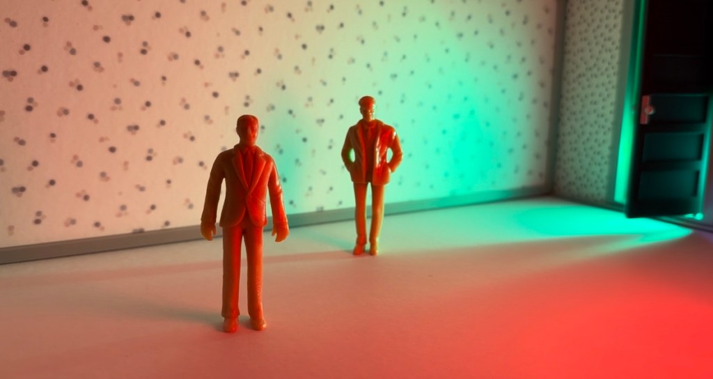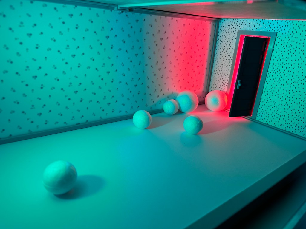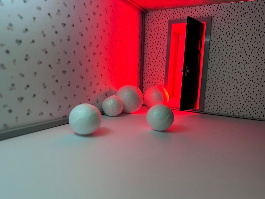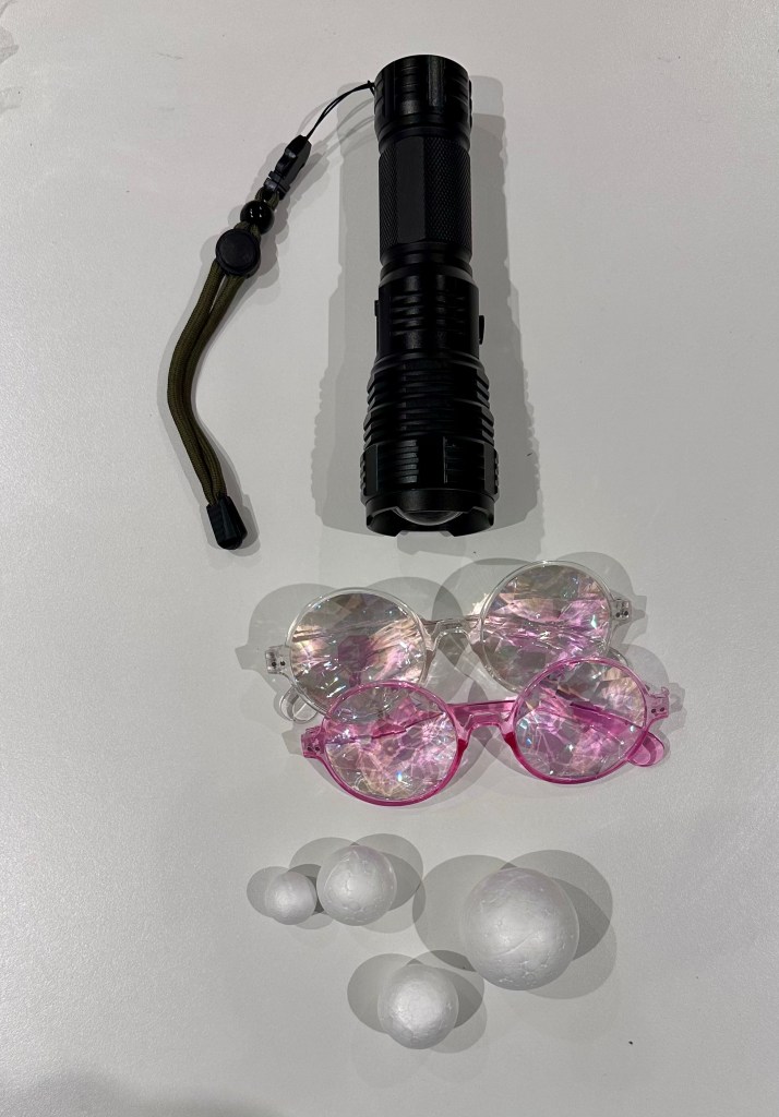 I got some different coloured gels and used a torch and a powerful table light to experiment at home. I found an old dolls house that someone had chucked out and used it to place figures and polystyrene balls in to try different lighting scenarios. I also found some old festival prism glasses that one of my sons had and I used them alone and with a blue gel to make a lighting set-up.