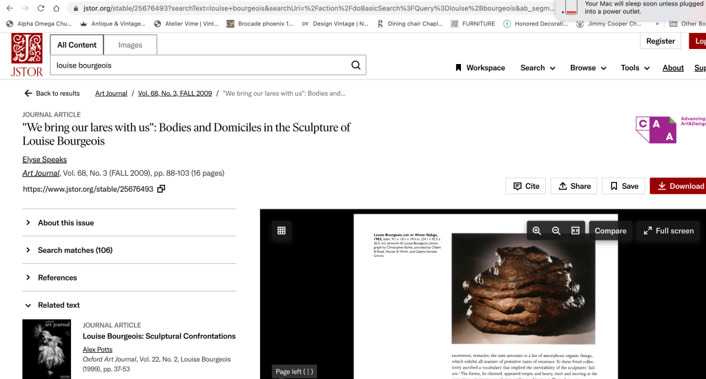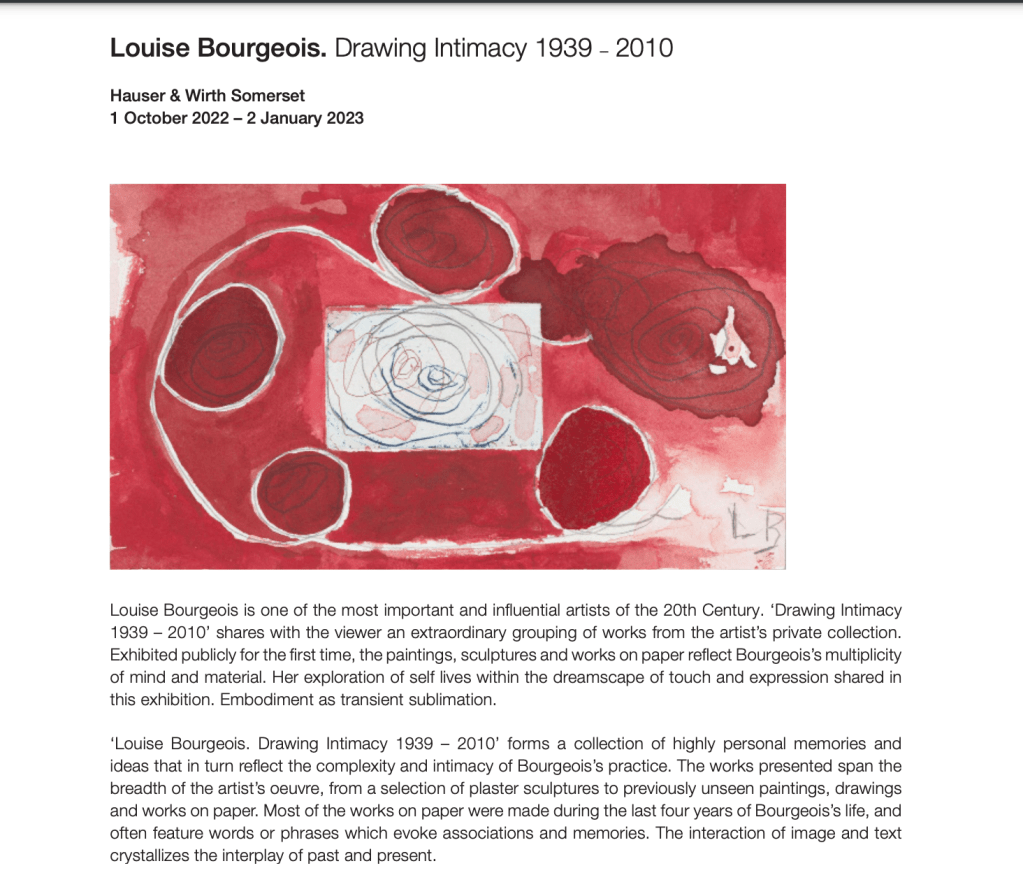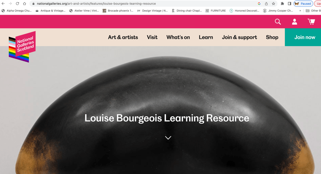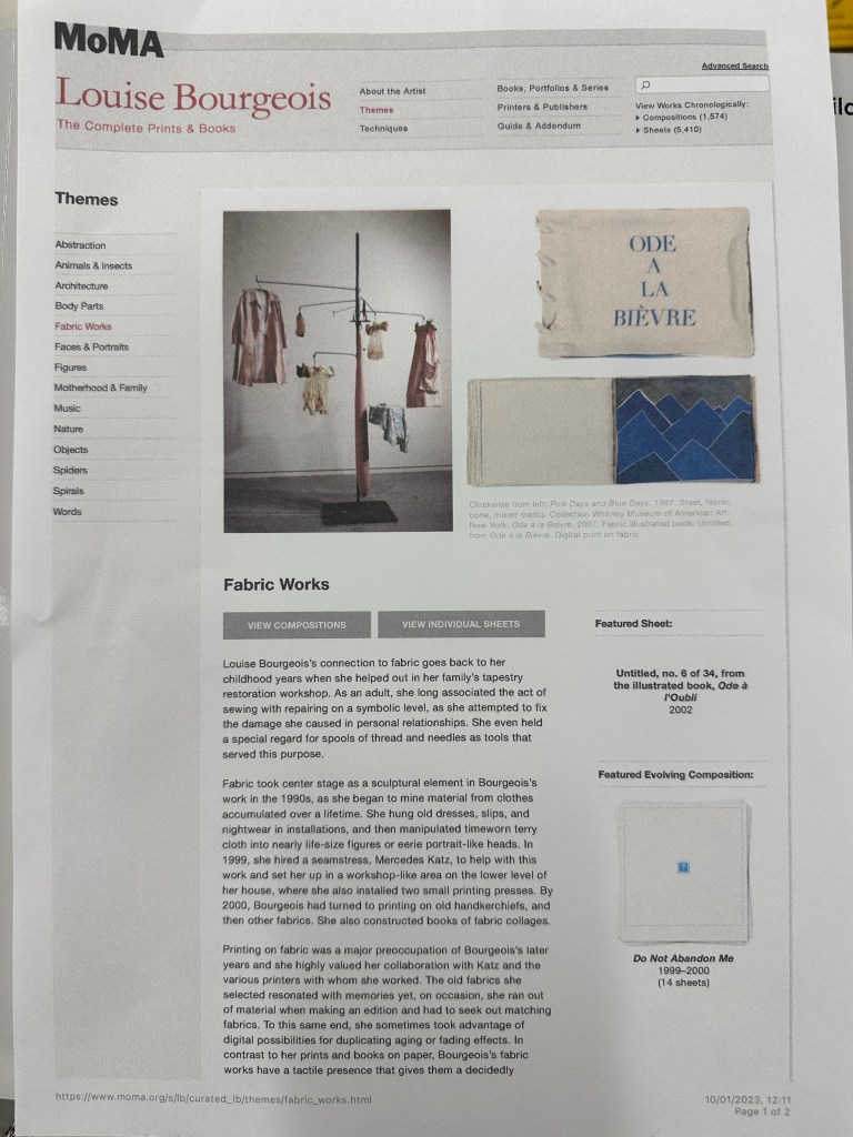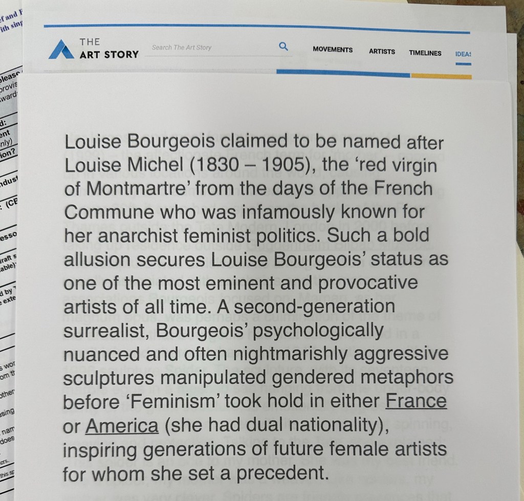 I found scanning through academic texts about Bourgeois helpful. Her work and her life have been the subject of much writing and analysis. There are many published online and I downloaded a few free papers to help me to grasp a much fuller understanding of information relating to her exploration of trauma through her work.