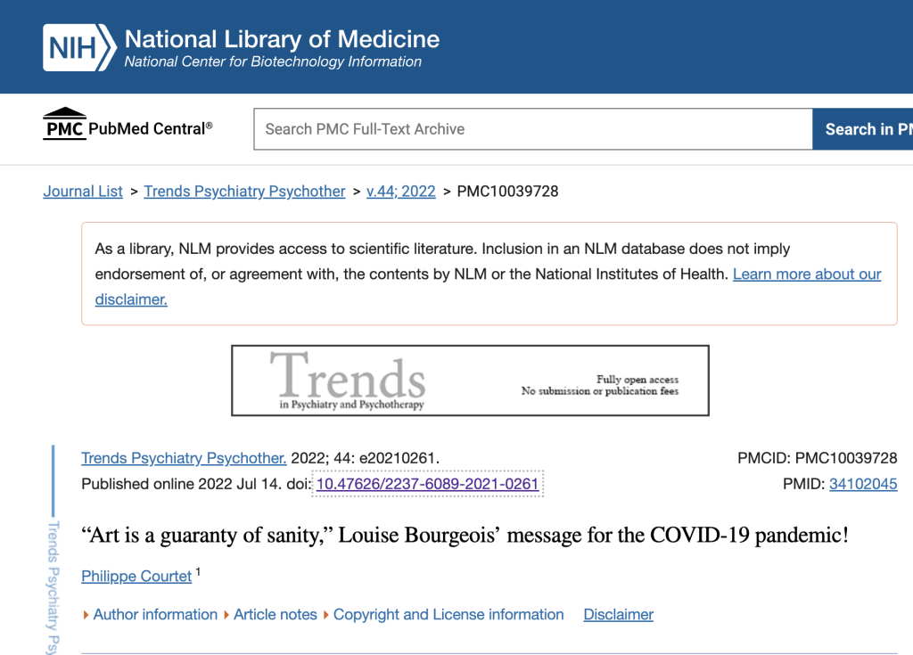 Looking at Dissertations and Thesis that are published on University websites gave me both broad background and also specific information. I found galleries that had learning resources about Bourgeois particularly helpful.