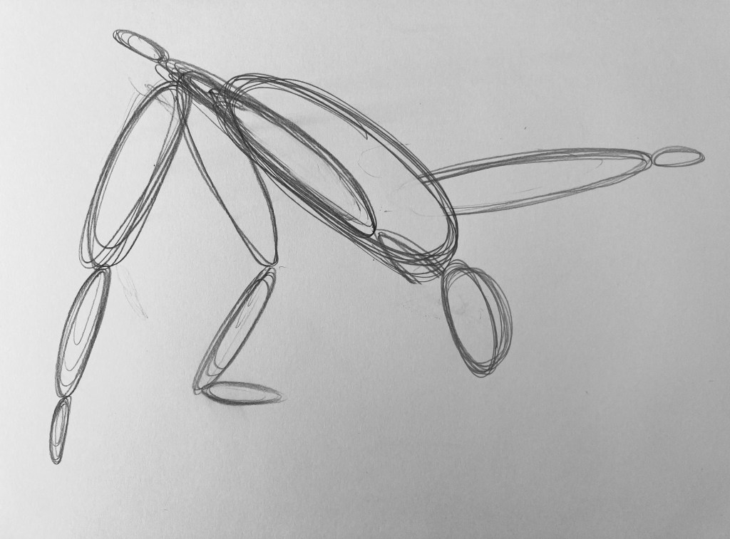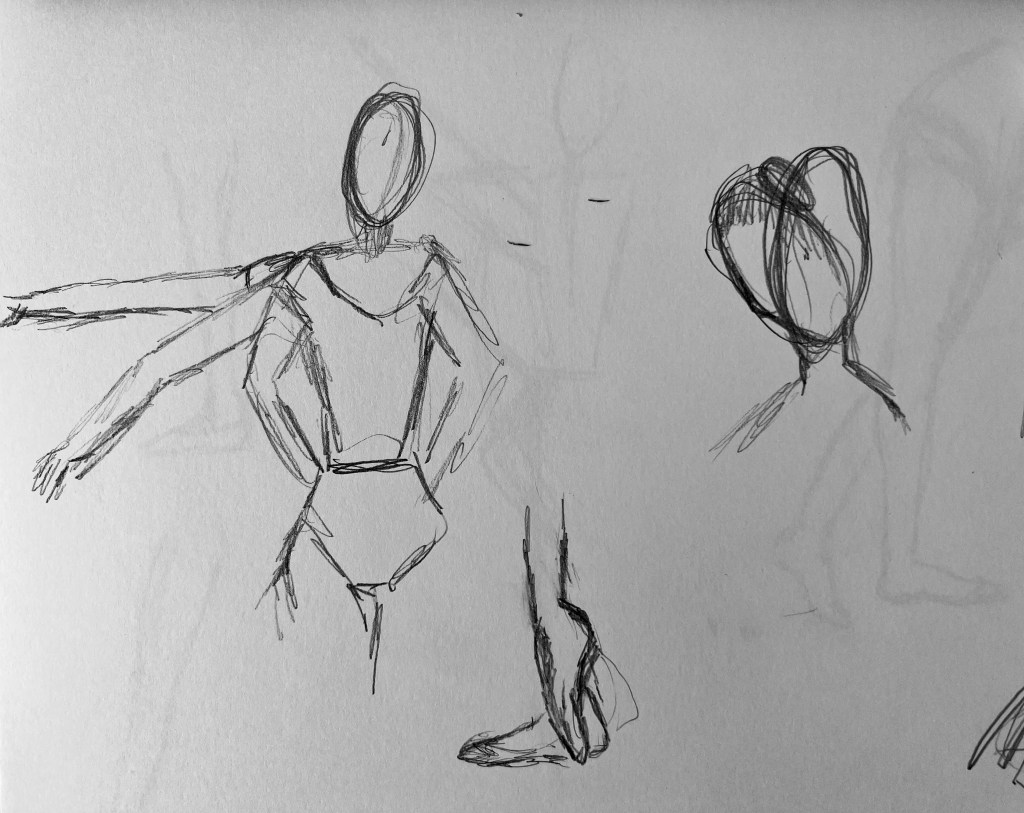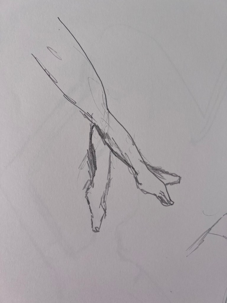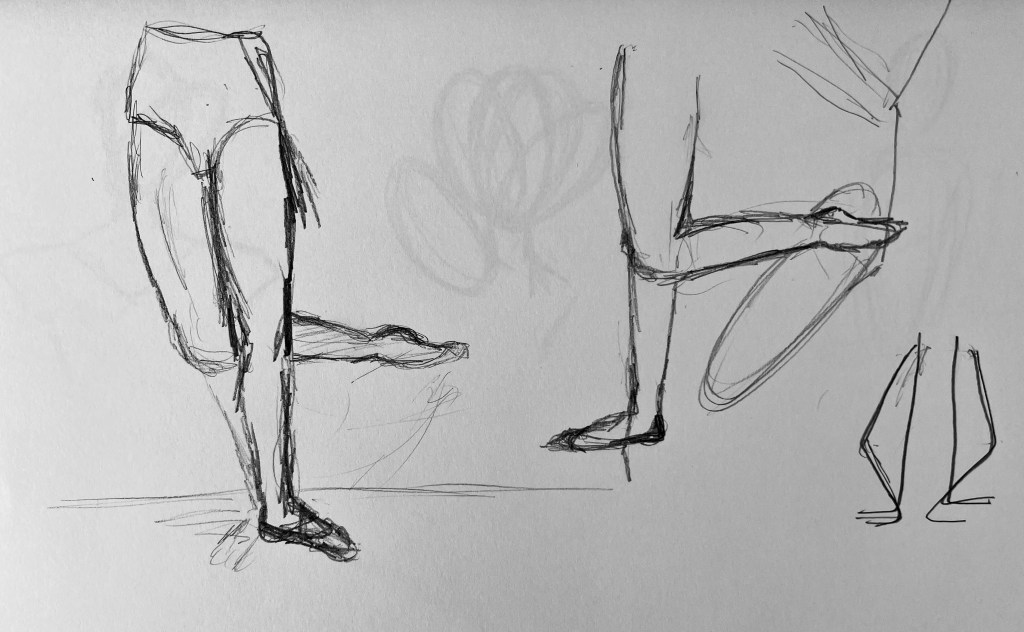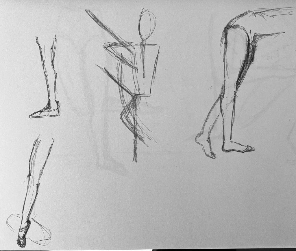 I found the actual drawing really hard. I imagined my pencil would flow smoothly and purposefully over the page creating whirling, swirling images of dance as I watched this magical scene. Well….. that definitely didn’t happen! When I first started, I just couldn’t think how I could show movement in any way at all. I started by drawing a foot then a head and as the class progressed I felt more relaxed and confident so experimented a bit more and added to the static single limbs creating the beginnings of a sense of movement. Towards the end of the lesson I was really focused and enjoying trying different ideas. I started to get a real idea of drawing movement and I feel confident to keep experimenting. I was satisfied with the drawings I did because I could see my improvements as the lesson went on.