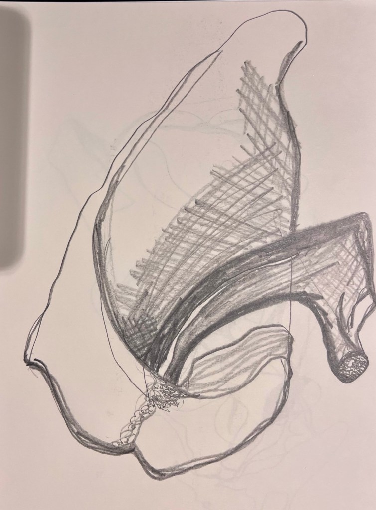 This was our very first task that we embarked on the afternoon of our first day. I was a bit shocked that we were starting drawing so quickly and felt initially awkward but once we started, I found myself absorbed in the process although I found the drawing under timed conditions hard and I was frustrated by my drawings as I wanted to make them better.