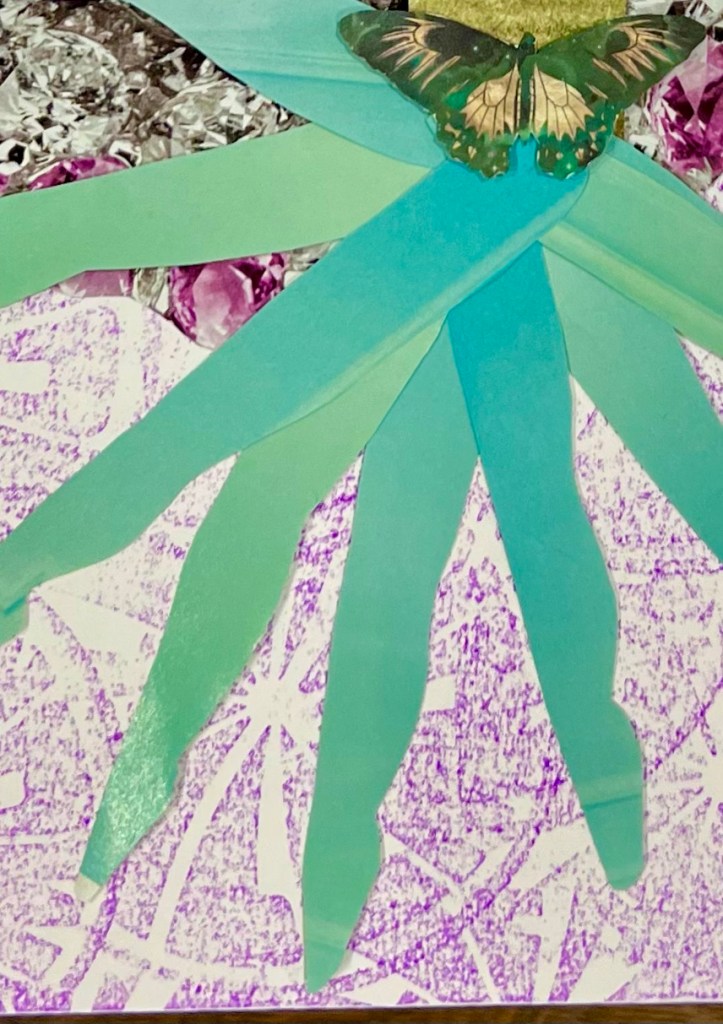After sketching the ENB in a class, trying to capture movement with pencil and charcoal, we looked at capturing movement using collage. In this piece, I wanted to create a feeling of swirling around so I made a background of patterned circles using some rubber packaging material that had a round design embossed on it. I then made an ink pad by putting some purple ink on cotton wool and trying out different pressures of ‘stamping’ until I got this pattern. I cut out dancers legs from pages in magazines and fixed them in this shape, trying to portray the stages of a leg kicking upwards. I chose these particular pages to use because the colour reminded me of the Tiffany’s blue which made me think of Audrey Hepburn as Holly Golightly in the film Breakfast at Tiffany’s. The colour is iconic and it connected me to the film character who is a free spirit and the actress who was so elegant and graceful, like the dancers. The other cut out parts symbolise the movement of arms and hair and the swirling, sparkling diamonds add to the feeling of something that is not static. The butterfly is of course a symbol of transformation which is what I observed happening when the dancers moved from their initial still, statue-like pose, suddenly bursting into life with beautiful, strong and elegant movement.