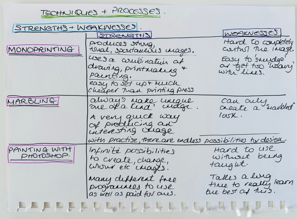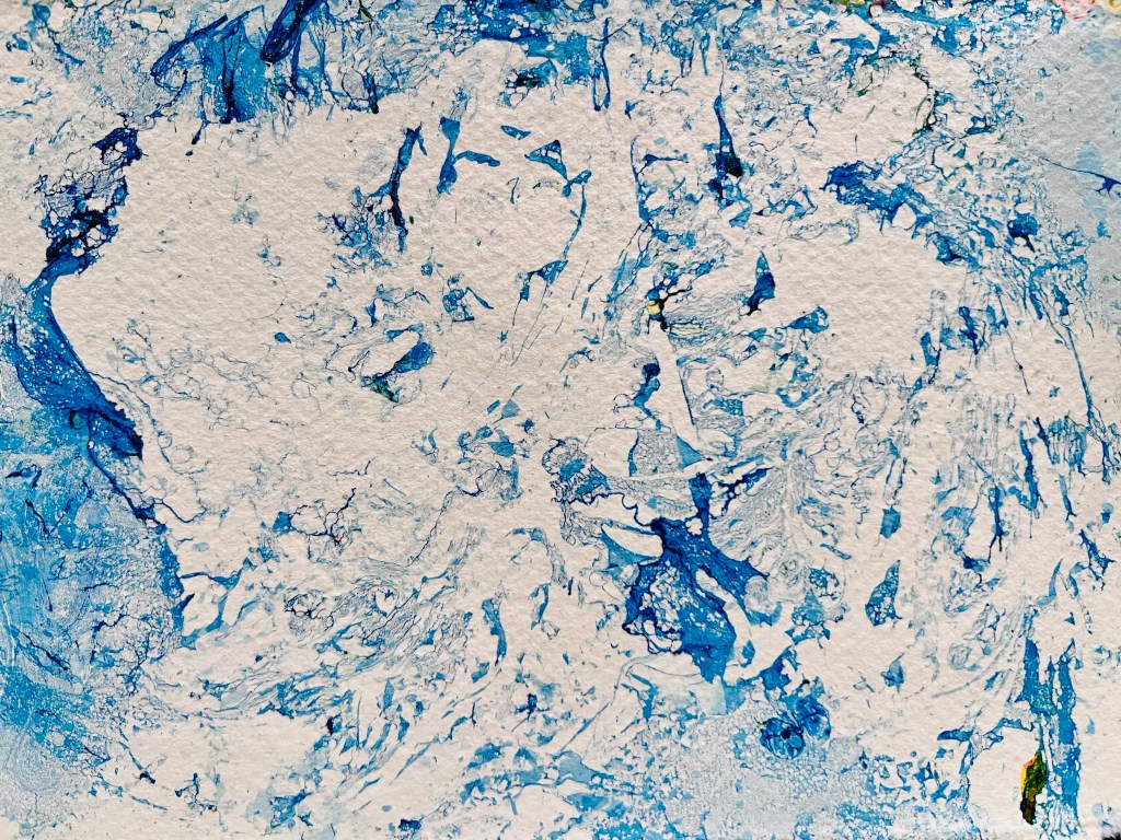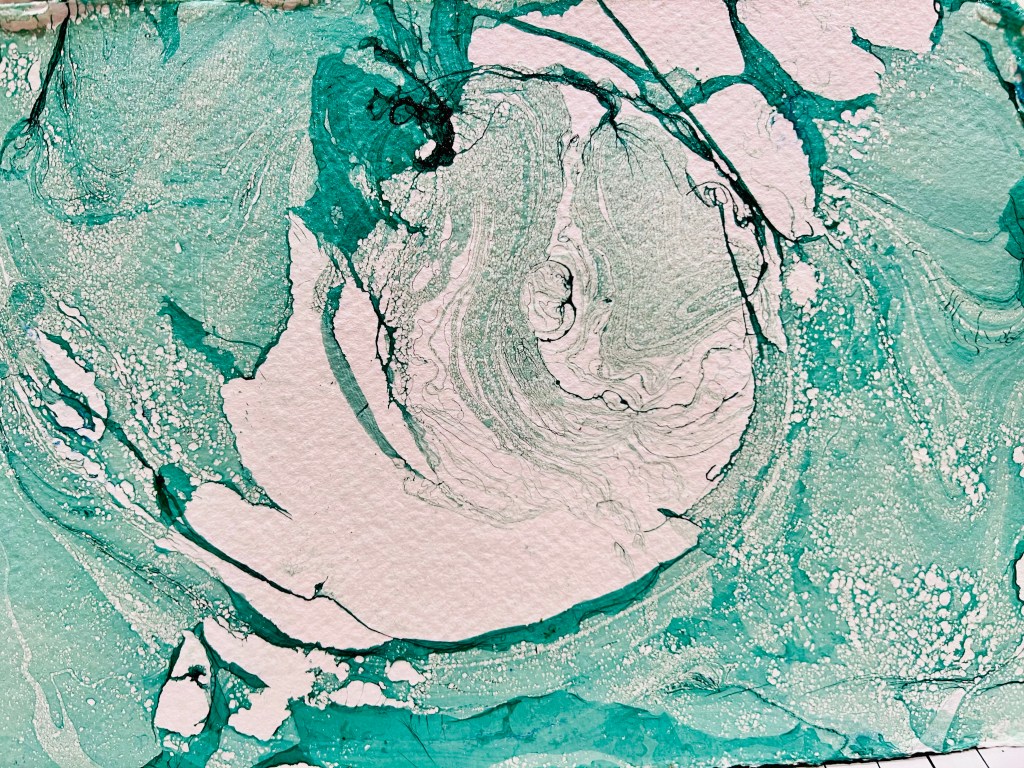 I loved the instant gratification of the marbling! Immediately and with absolutely no prior experience, me and all my fellow classmates were producing great work!! I made many different patterns on lots of bits of paper and if I am honest, for the most part it was pretty much pot-luck what they would look like once I had pulled them out of the tray but the more I did I started to notice how I could control the result a little more each time a therefore create different pattern . I felt that I could use this technique in future especially if I was creating a collage. I continued to experiment at home with some coloured ink which created some great results and I used one of the images as a background in the ‘create our own Colour Wheel’ section of the painting module. I can see how combining different practises can create really interesting results.