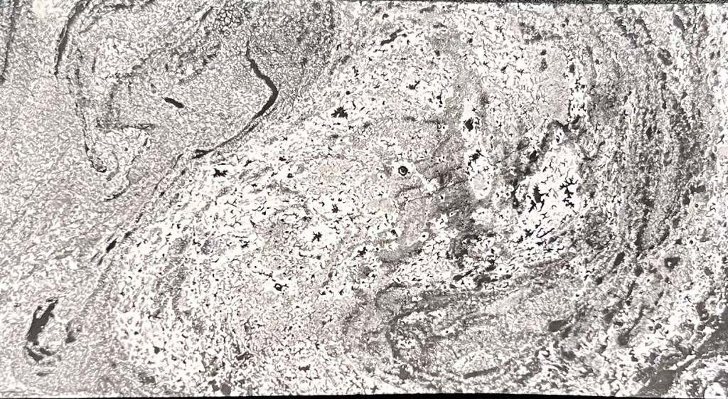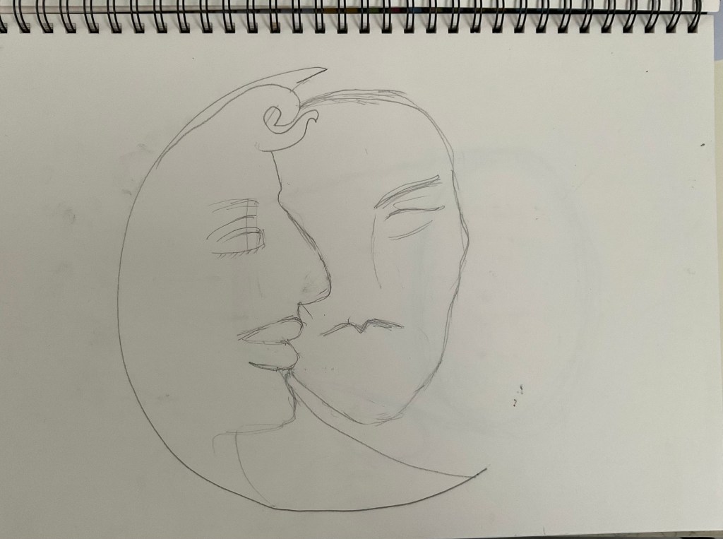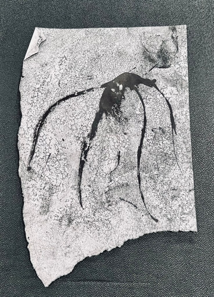 Printing ink spread on glass then paper placed on top and image drawn. Above right is image when another piece of paper is place on glass straight afterwards and rolled over vigorously which creates a negative image. I discovered this purely by chance but I almost prefer the negative image. I enjoyed learning about this technique and initially I thought it would be easy but I found that i will need to learn how to control the outlines created as I felt mine looked a bit heavy handed. (excuse the pun re the first image!)