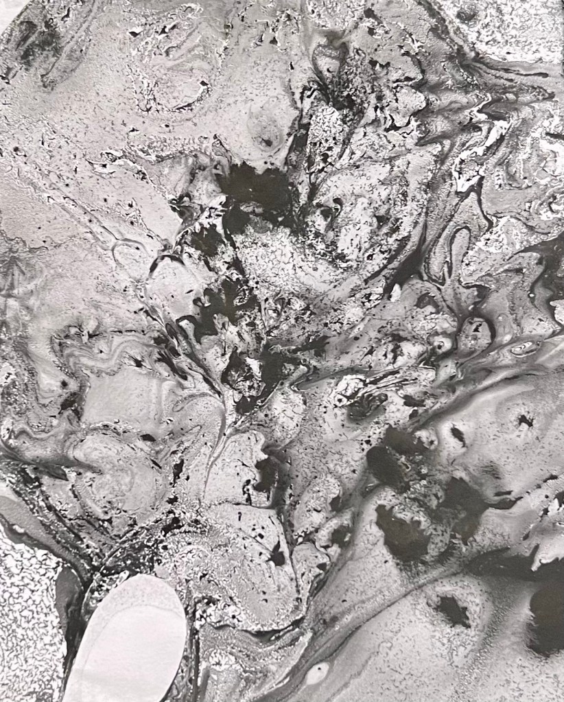 I chose to make a cup of tea with some of my marbled papers as I noticed that one of them had what looked like a drop of liquid hitting a surface of water and bouncing off – like a drop of milk in a cup of tea. And the ritual of making tea is historically sacred and important and remains both of these things for me today.