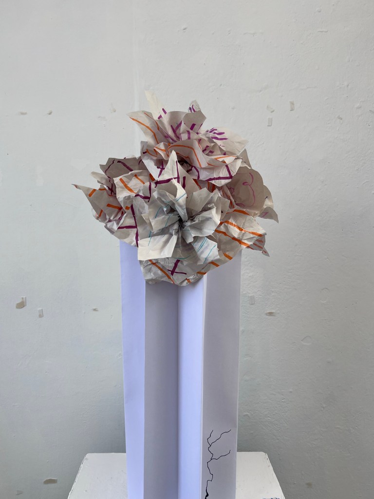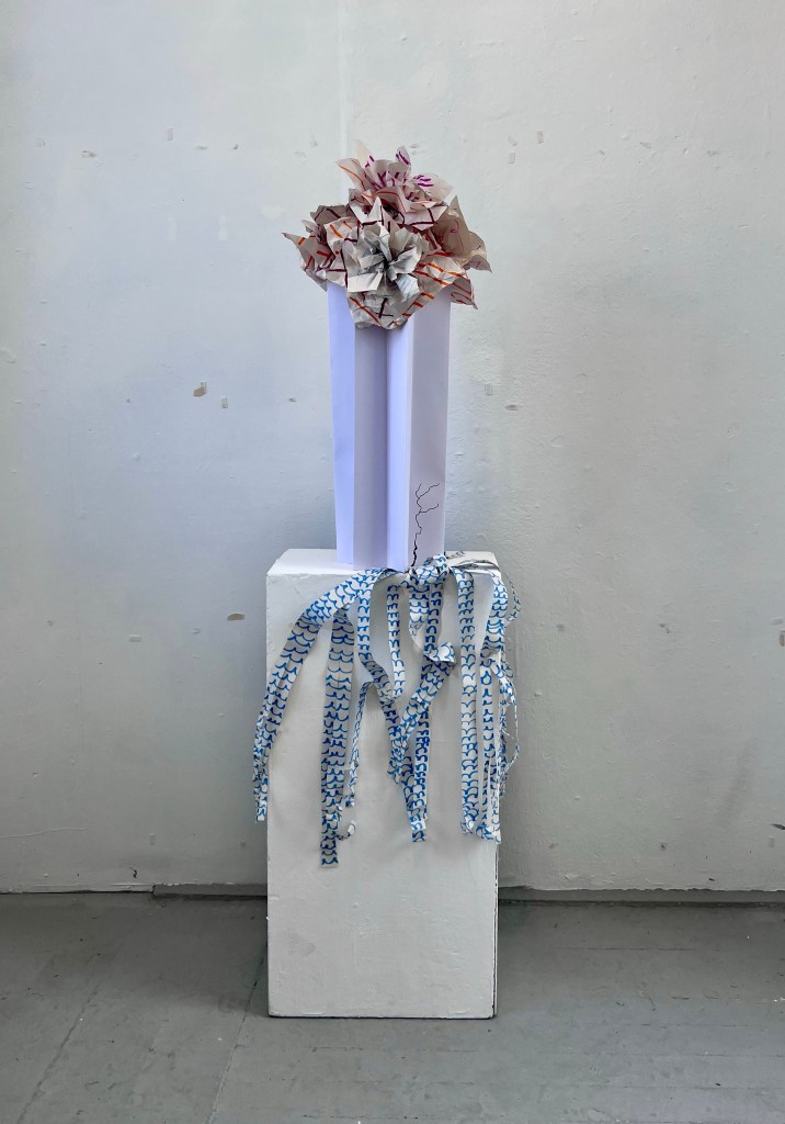 We started with thick, matte, white paper which we folded into equal, straight folds to create a concertina effect which we then made into a tall vase shape. Having placed that on the plinth, we took thinner sheets of paper and created different patterns with felt tips, pencils and crayons then we scrunched them up to give extra texture. We used these to make flowers that we placed in the vase. Finally we drew a crack in the base of the vase and made long ribbons with blue wave patterns to represent water cascading out the crack and down the plinth.
